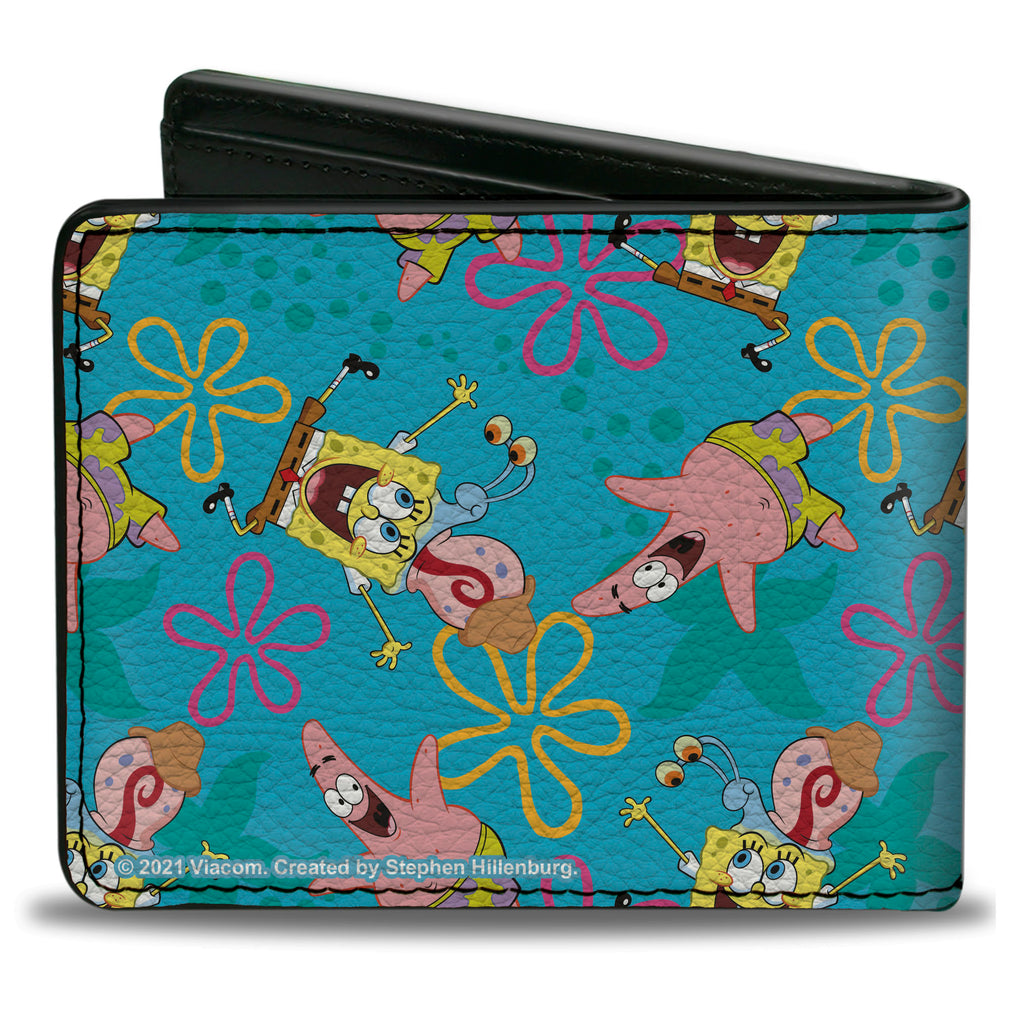 Wholesale Bi-Fold Wallet - SpongeBob Patrick and Gary Joy Poses and Flowers Scattered Blue | Wholesale Bi-Fold Wallets