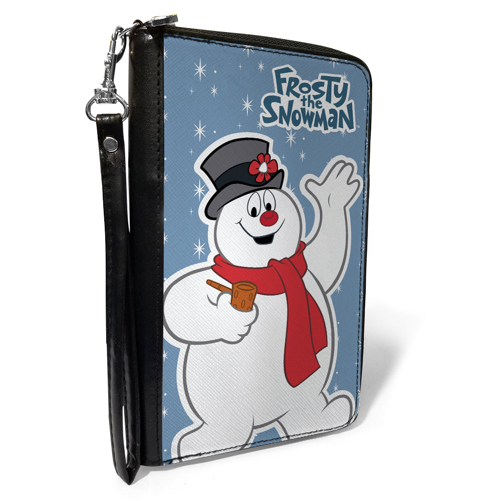 Wholesale Women's PU Zip Around Wallet Rectangle - FROSTY THE SNOWMAN Waving Pose Blue White | Wholesale Clutch Zip Around Wallets