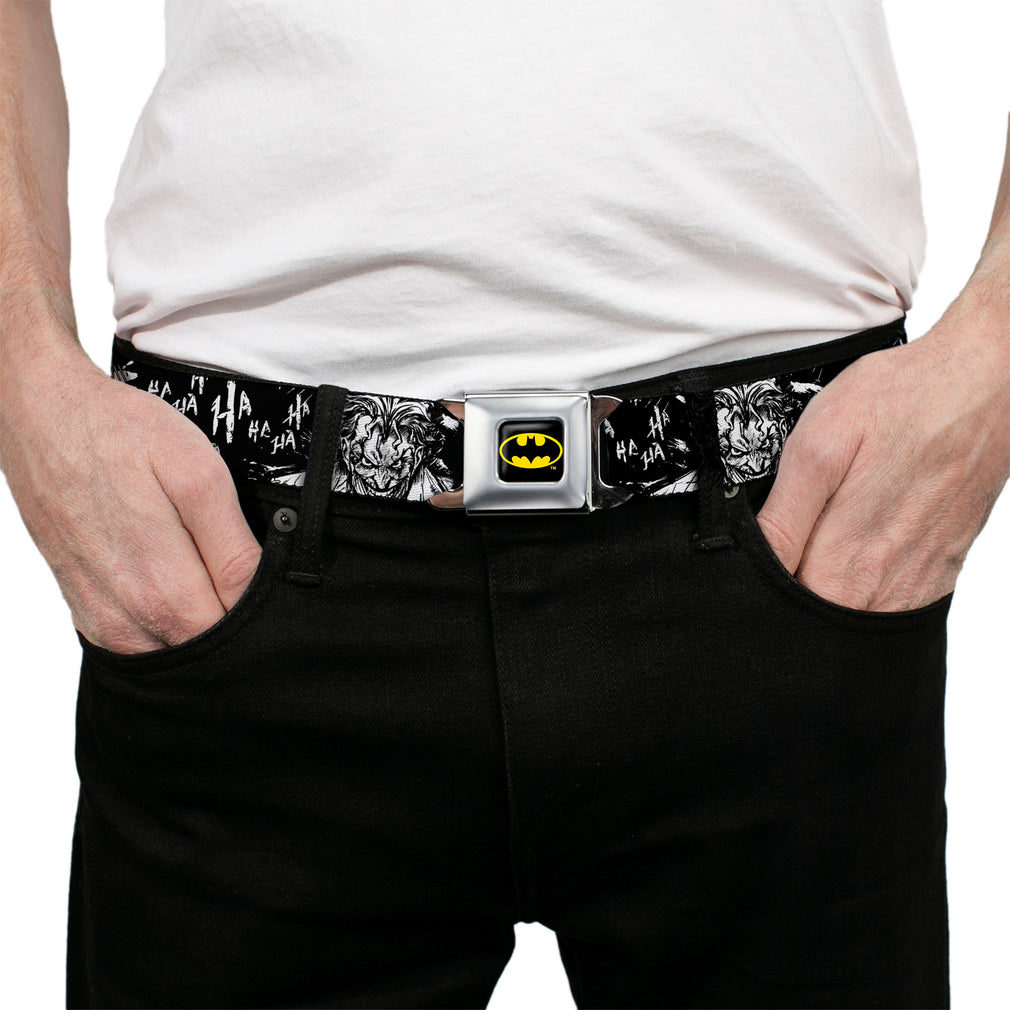 Wholesale Batman Full Color Black/Yellow Seatbelt Belt - Batman THE DARK KNIGHT and Joker Smiling Sketch Close-Ups Black/White Webbing | Wholesale Seatbelt Belts