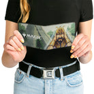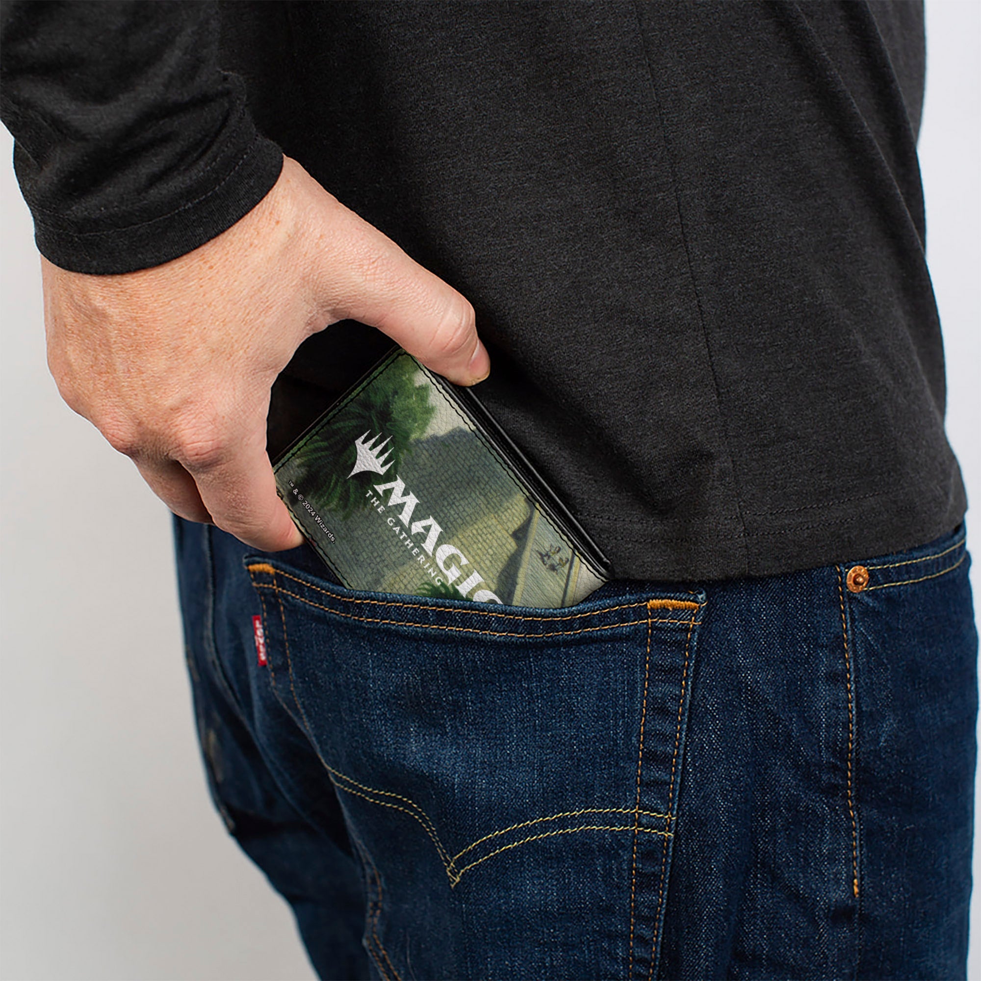 This awesome men's bi-fold wallet is made from premium vegan leather. It measures 4.0x3.5x0.5 Inches, and features the standard billfold, 5 card slots, and windowed ID holder. The logos are applied using advanced printing technologies, so the wallet will still look good after years of hard use. This product is made by Buckle-Down, Inc. and Officially Licensed by Wizards of the Coast.