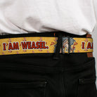 Wholesale I AM WEASEL Title Logo Full Color Black/White/Red Seatbelt Belt - I AM WEASEL Title Logo with IM Weasel and IR Baboon Pose Yellows Webbing | Wholesale Seatbelt Belts