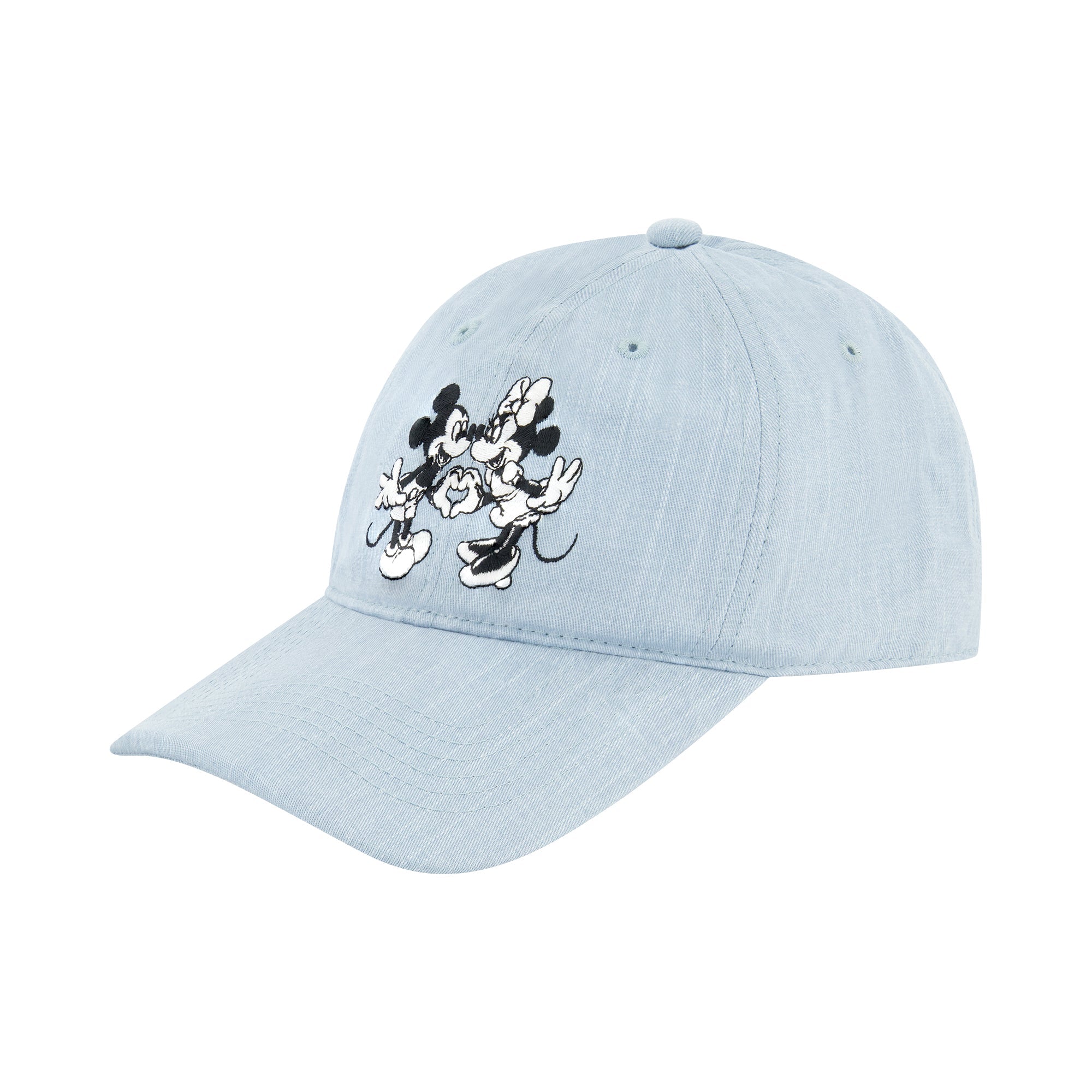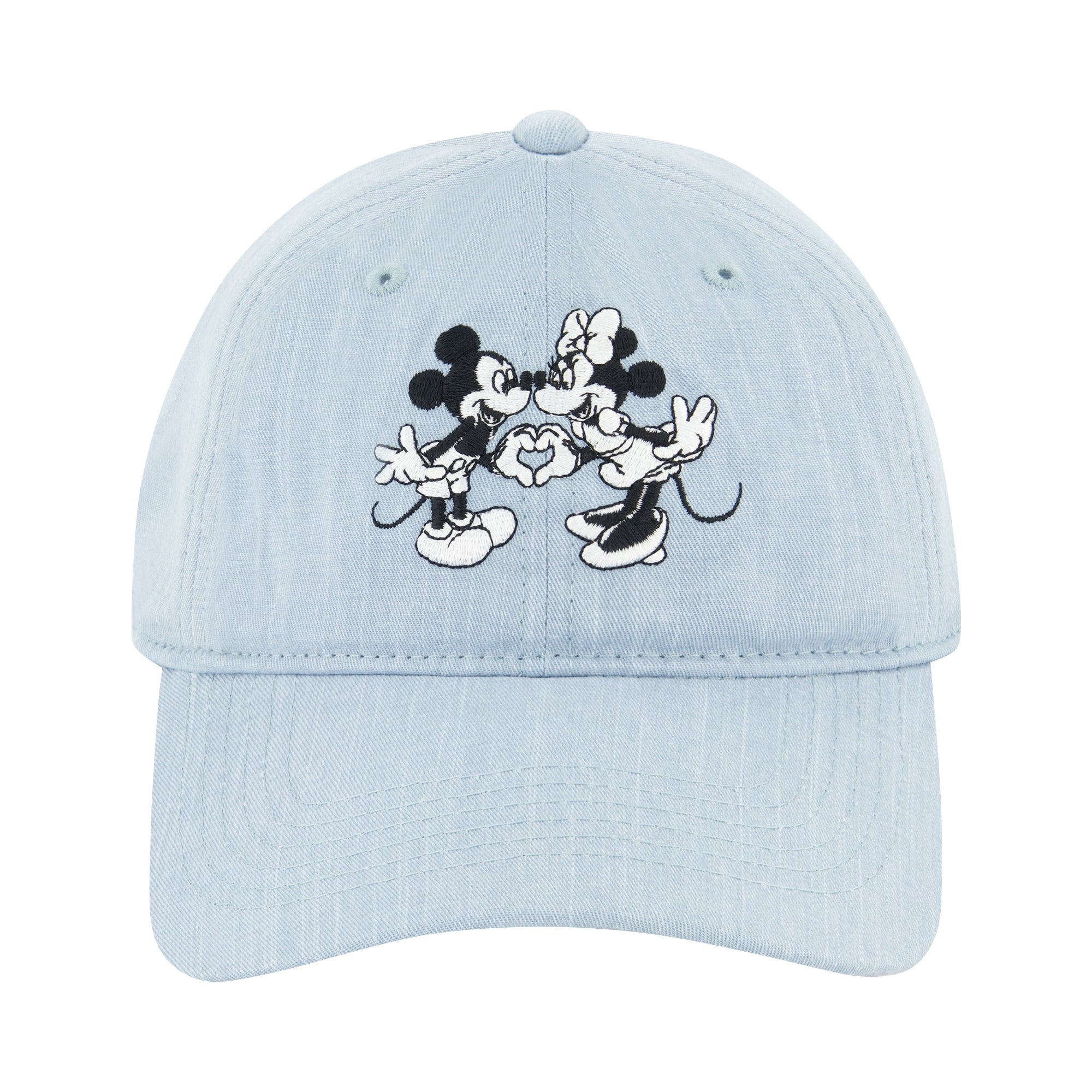 Celebrate the magic of Disney’s most iconic duo with this officially licensed Mickey and Minnie Mouse dad cap. Made in a soft chambray finish, the hat features a sweet embroidered design of Mickey and Minnie creating a heart with their hands. With its relaxed fit and adjustable back strap, it’s perfect for everyday wear, whether you’re at the parks or adding a playful touch to your casual look.