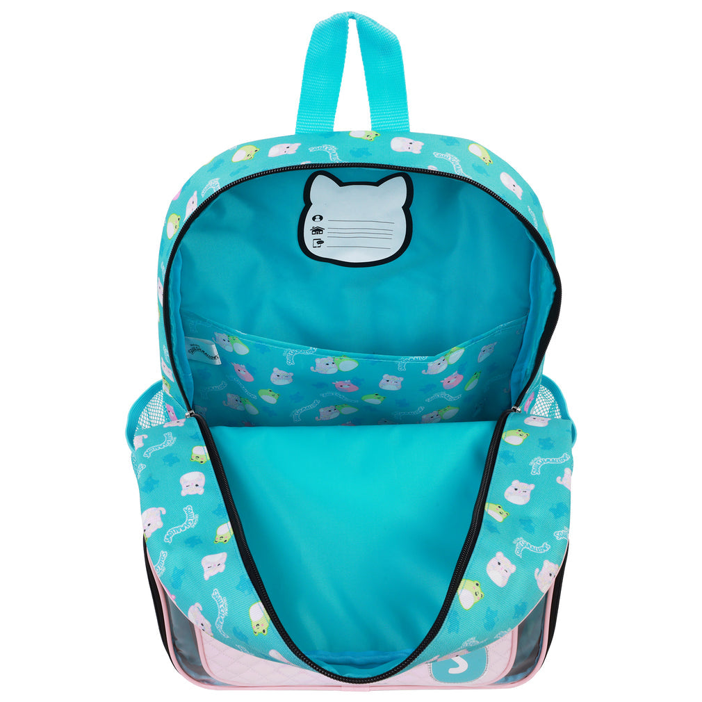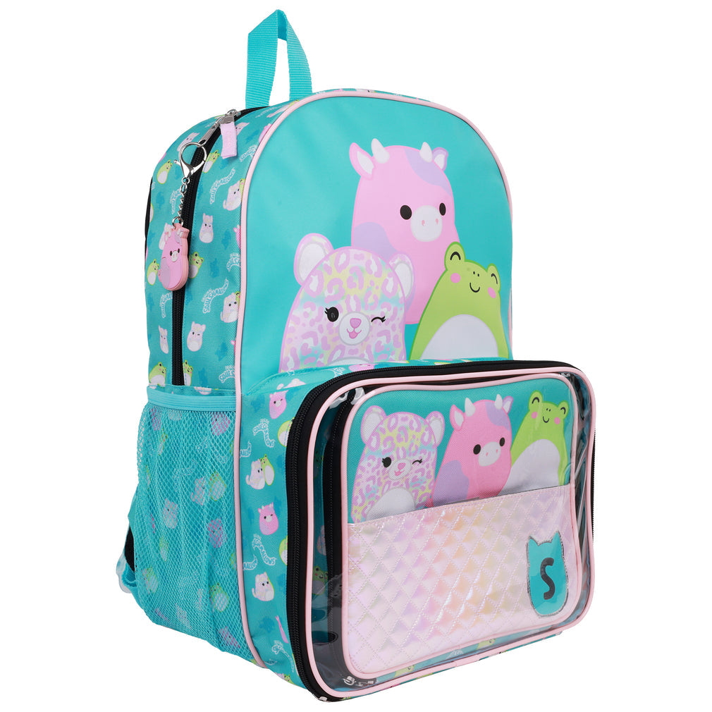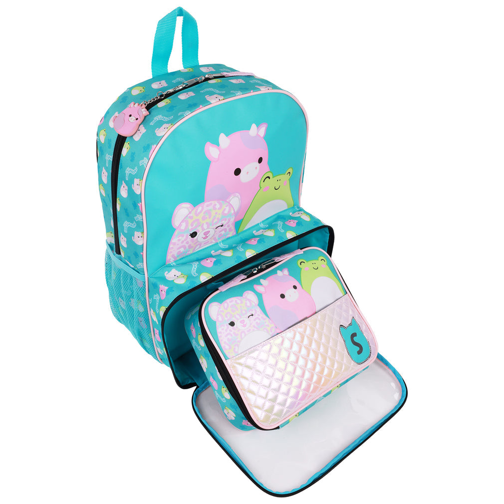 Bring your favorite plushy pals everywhere you go with this adorable Squishmallows 2-piece backpack and lunch box set! Featuring vibrant pastel artwork of your favorite Squishmallows characters—like Cam the Cat, Rosie the Pig, and Wendy the Frog—this matching set is perfect for school, playdates, or weekend adventures. The roomy backpack offers plenty of space for books and school supplies, plus side mesh pockets for extra storage. The detachable lunch box features the same cute crew and a quilted iridescent front pocket for a touch of sparkle. With padded shoulder straps, a top carry handle, and easy zip closures, this set combines functionality with all the cuddly charm Squishmallows fans love. Tag along with your Squishmallows squad—adorable, functional, and fun!