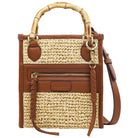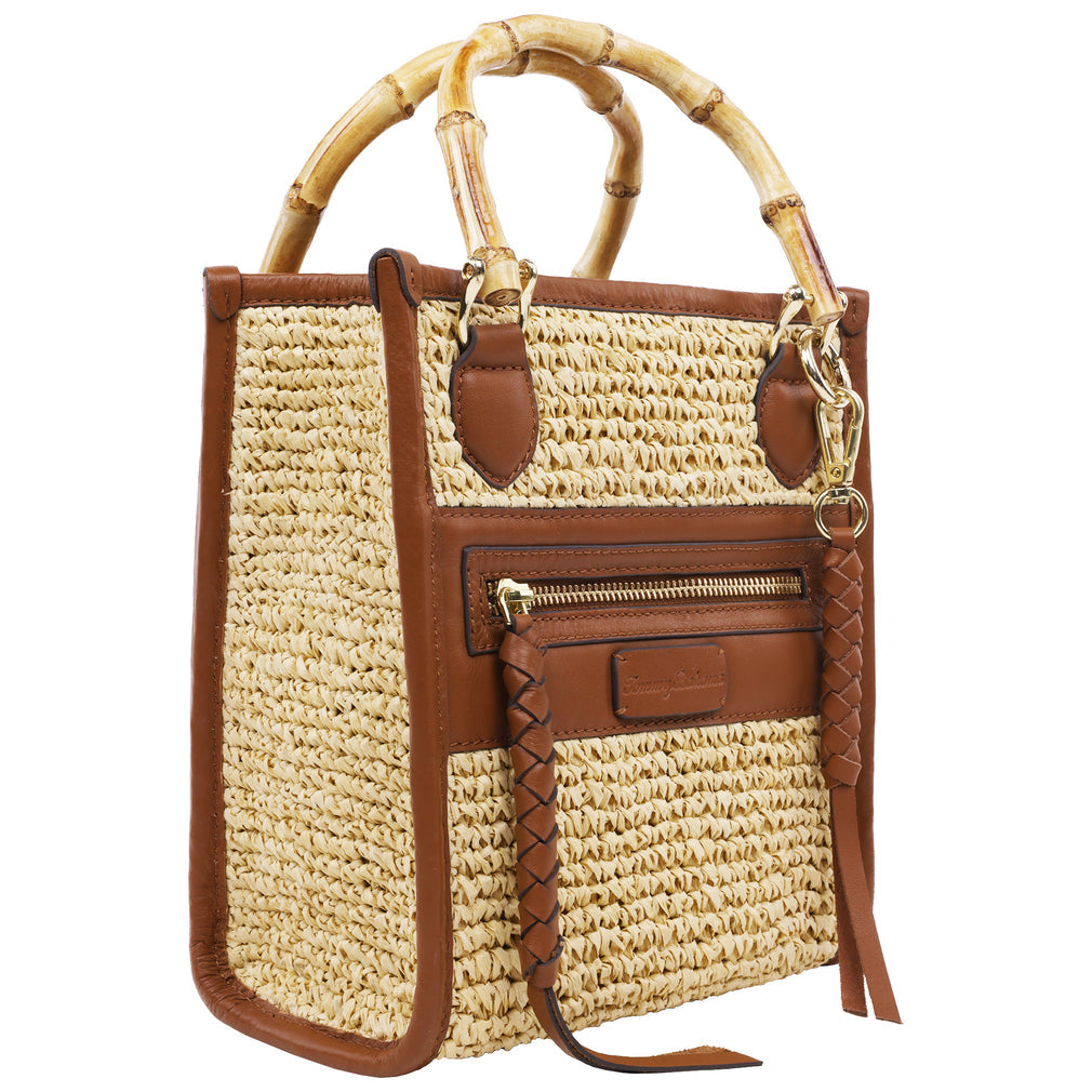Bring tropical sophistication to your everyday look with the Tommy Bahama Leather and Raffia Bamboo Handle Tote. This stylishly structured bag features woven raffia panels trimmed in rich cognac-tone leather, bamboo top handles for an organic touch, and a detachable crossbody strap for versatile wear. The exterior zip pocket with braided leather detail adds function and flair, while the roomy interior keeps your essentials organized from beach to boardwalk. Ideal for resort days, summer outings, or vacation styling.