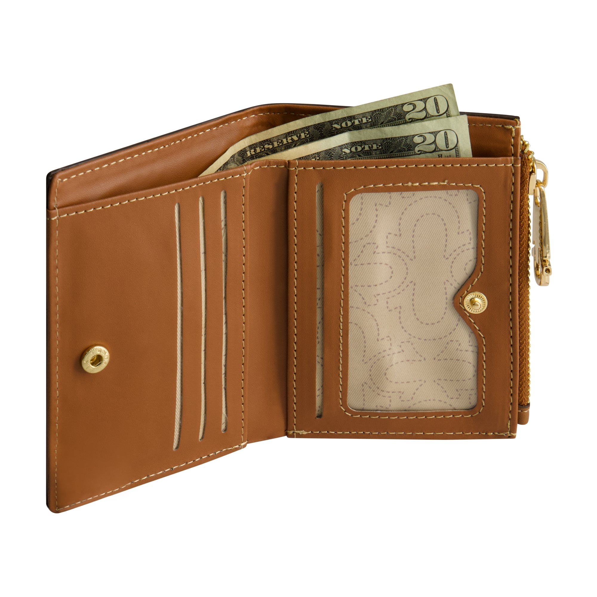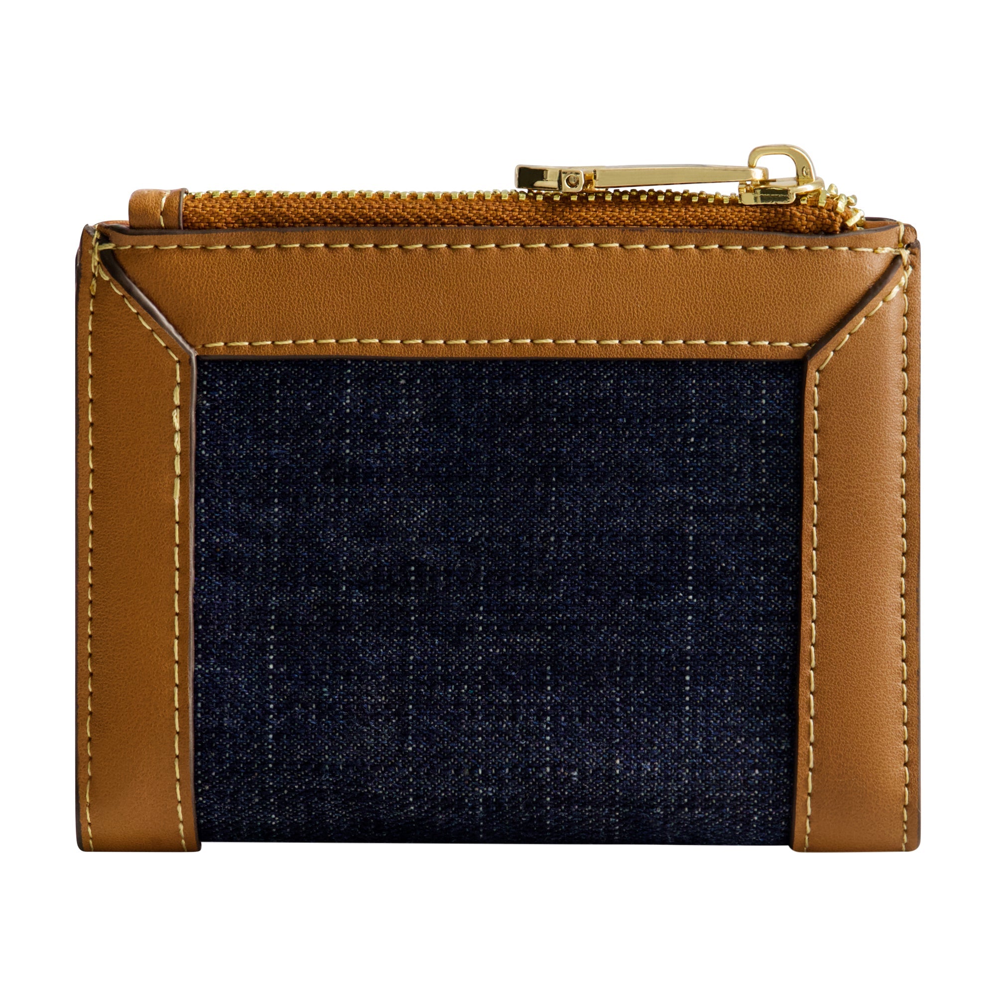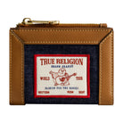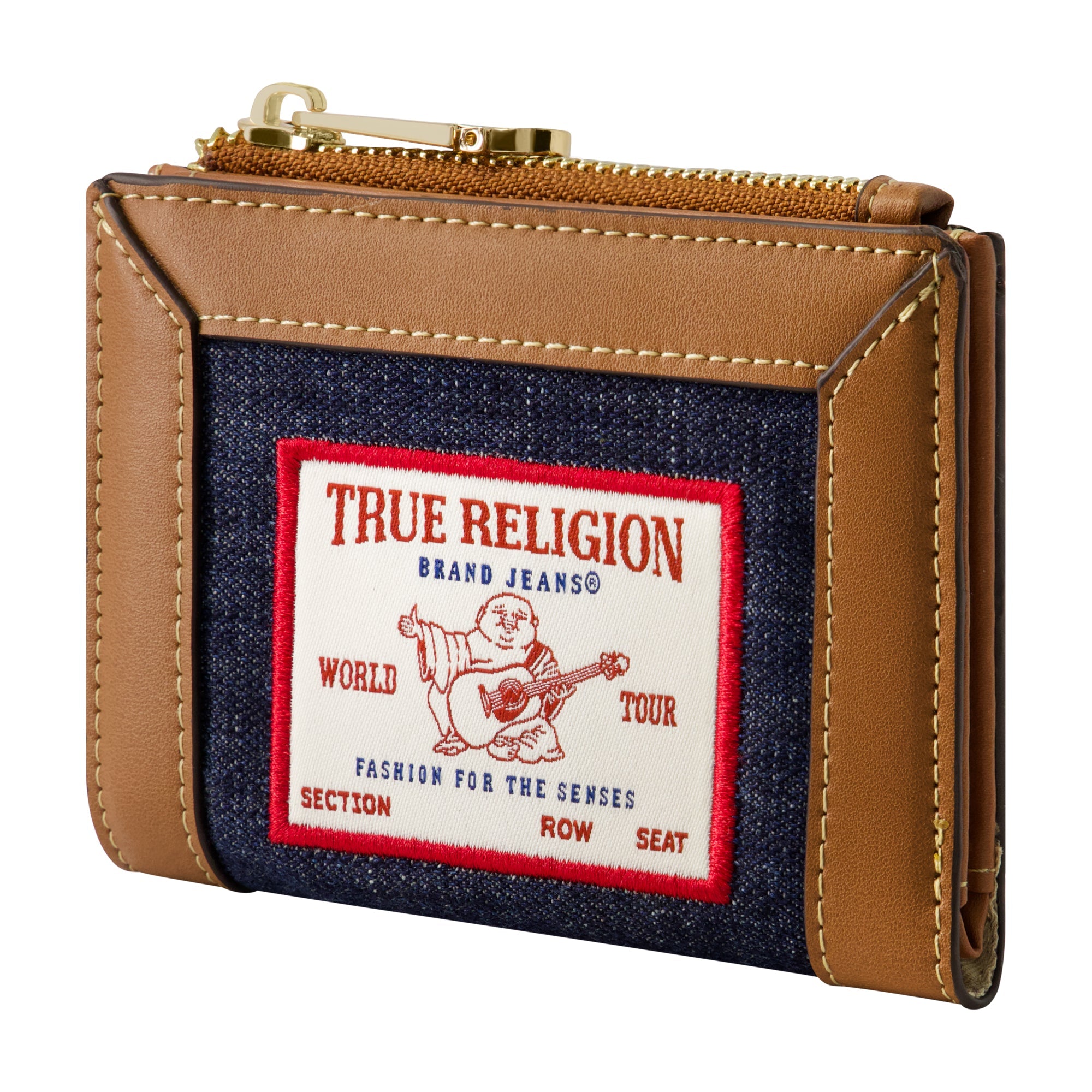 Compact and classic, the True Religion Buddha Patch Small Denim Wallet is the perfect accessory for your everyday needs. Featuring a sleek denim design framed with faux leather accents, this wallet combines style and practicality. The signature Buddha patch adds an iconic touch, making it unmistakably True Religion. Inside, you'll find card slots, a transparent ID window, and a zippered compartment to keep your essentials secure and organized. Ideal for slipping into your bag or carrying solo, this wallet is a must-have for fans of timeless denim-inspired fashion.