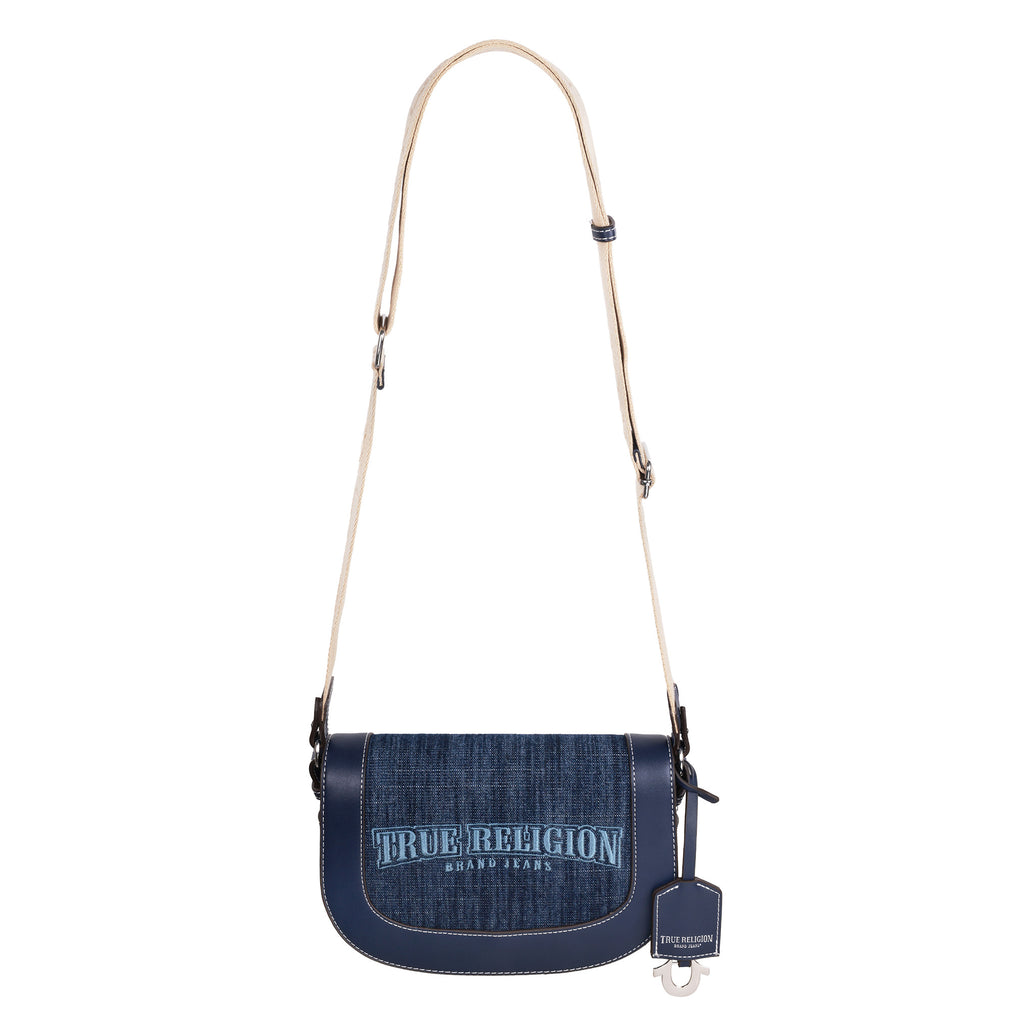 Elevate your streetwear edge with this True Religion Denim PU Logo Saddle Bag. Featuring a classic flap silhouette with embroidered branding across light-wash denim, this crossbody blends iconic True Religion style with everyday functionality. A contrast PU trim, adjustable logo webbing strap, and magnetic snap closure bring a modern finish, while the interior zip pocket keeps essentials organized.