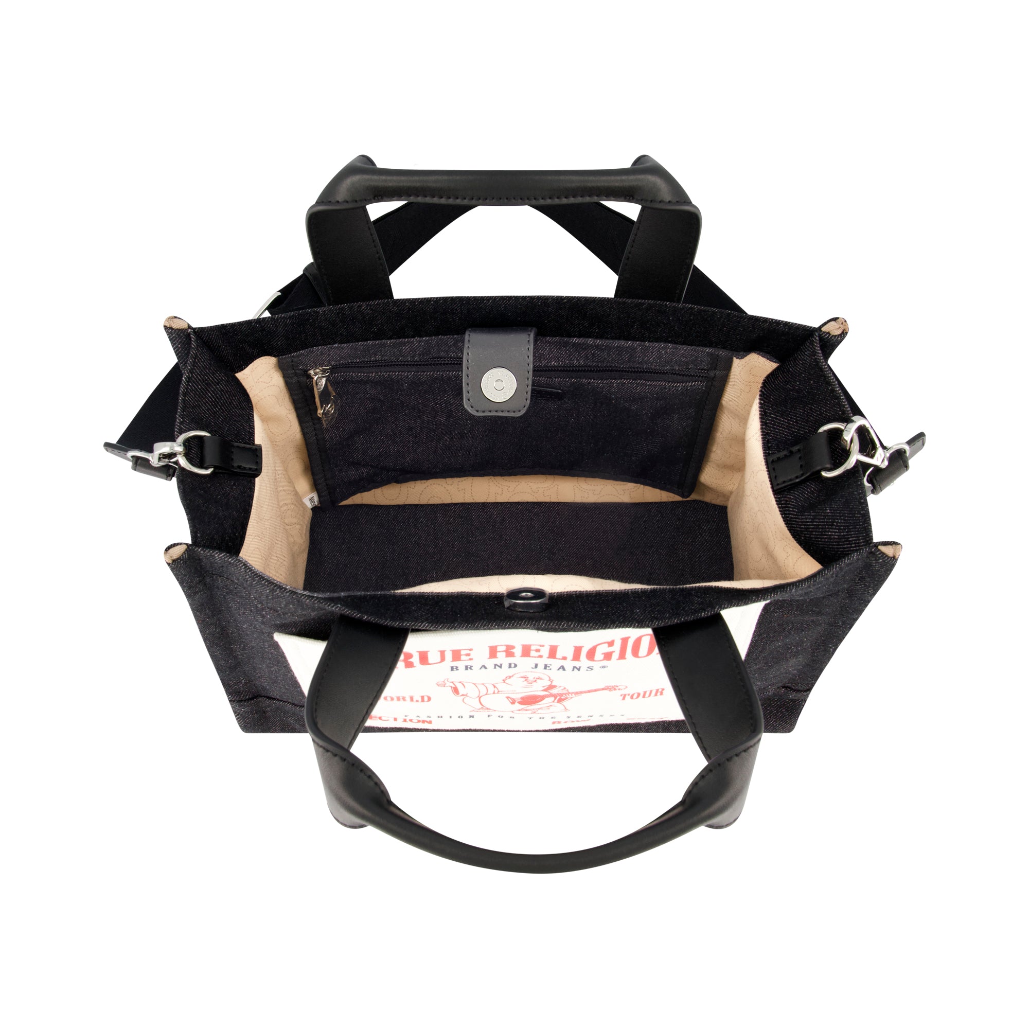 Keep your personal items conveniently accessible while sporting eye-catching style with the True Religion lady crossbody/ tote bag. Composed of lightweight polyester and durable cotton for long-lasting reliability, This bag features an interior backwall zip for storing your personal belongings, and the magnetic snap closure of the bag keeps your items secure inside.   The exterior front contains a slip pocket.  This cross-body bag features an adjustable shoulder strap with a drop of 16 to 27 inches so that you can easily travel wherever you need to go, and is an officially licensed True Religion product, ensuring that you are receiving genuine and authentic merchandise.