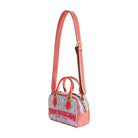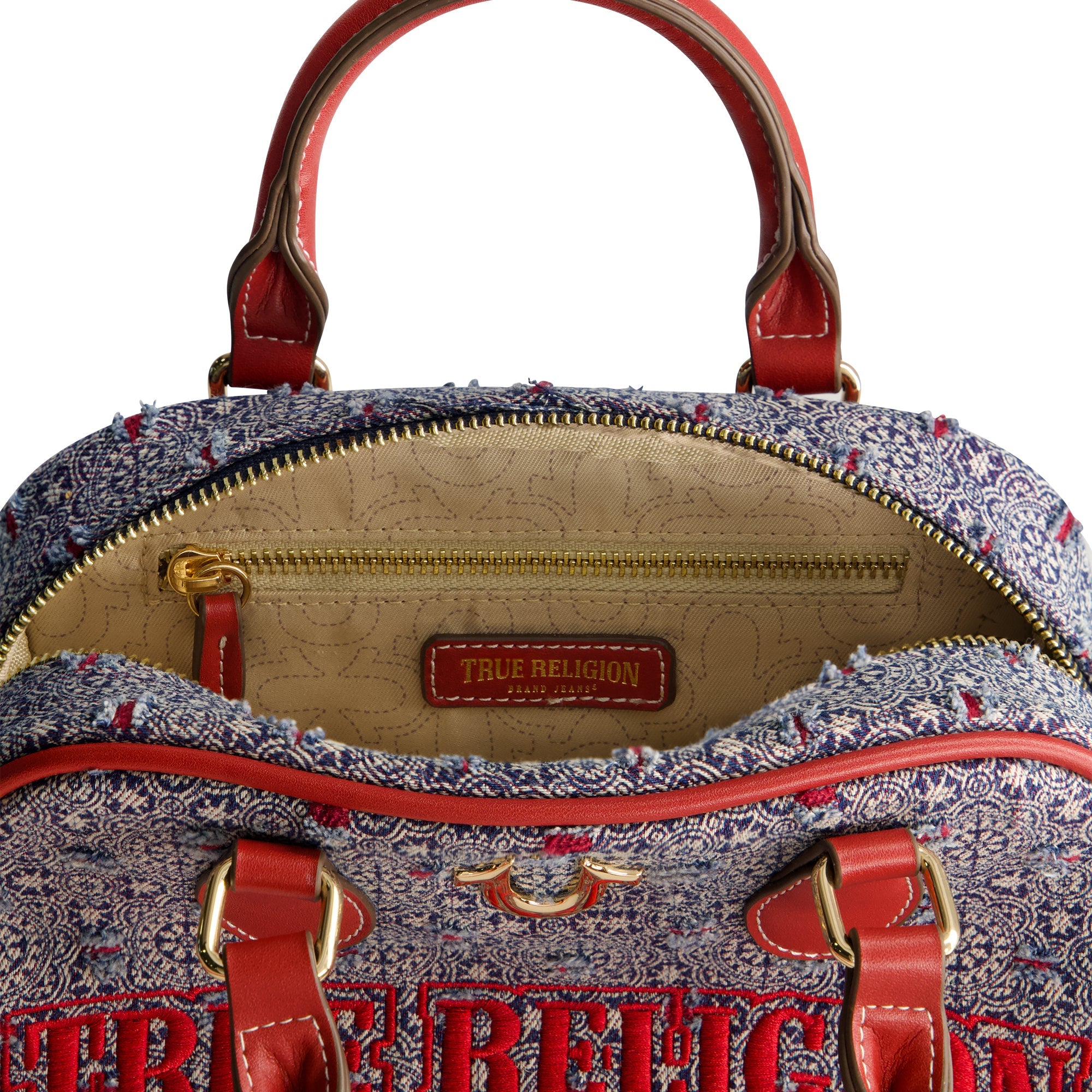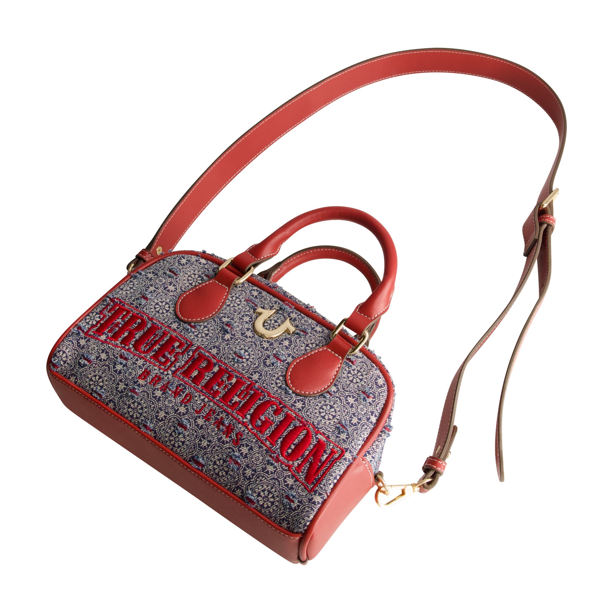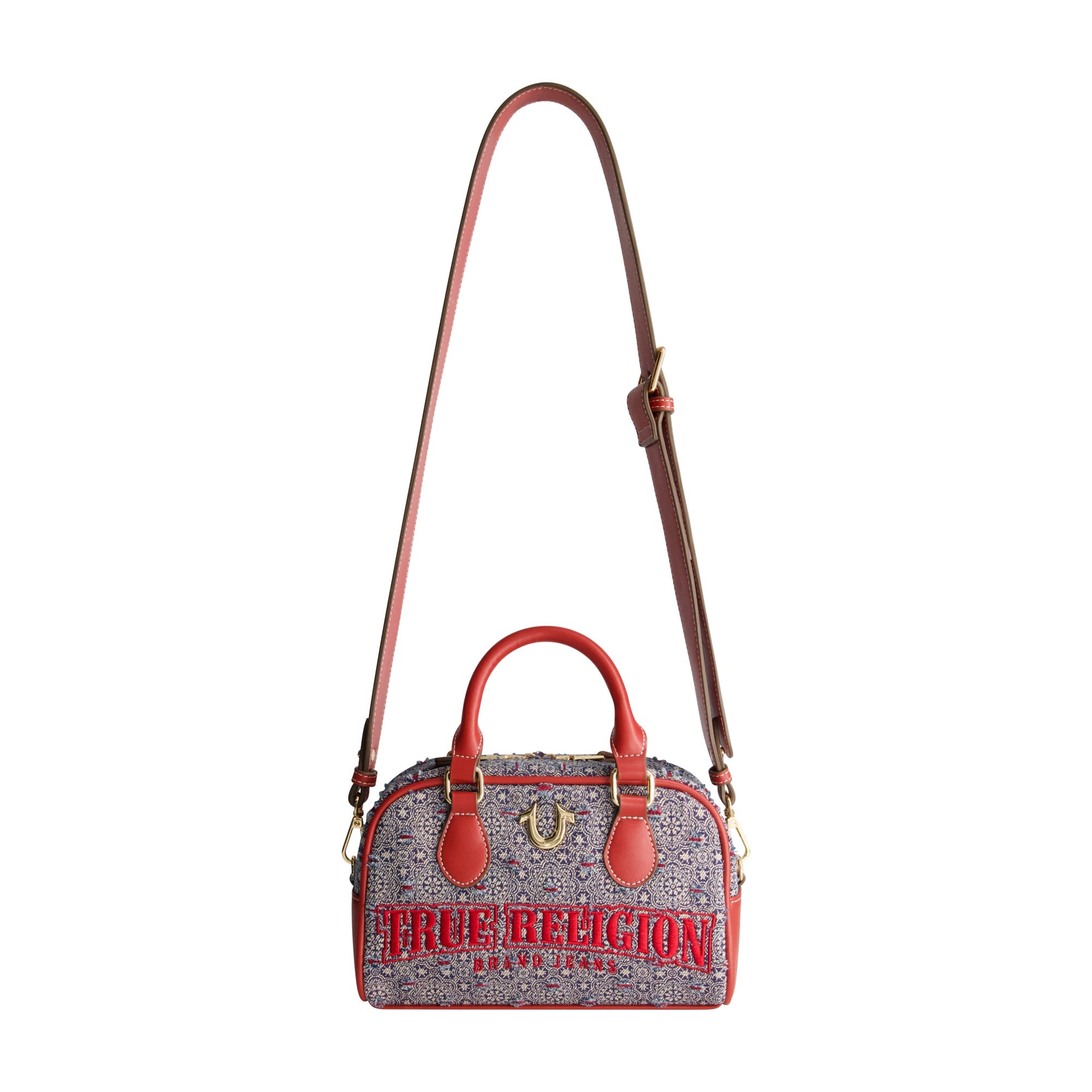 Add a touch of bold style to your wardrobe with the True Religion Tile Denim Mini Satchel. Designed with a unique all-over tile print pattern, this statement bag is elevated with embroidered True Religion branding and a signature horseshoe emblem for a standout look. The contrast top handles and trim add a striking pop of color, blending vintage inspiration with modern streetwear vibes.  Perfect for carrying essentials, this compact satchel features a secure zip-top closure, a detachable crossbody strap for hands-free styling, and an interior zip pocket for extra organization. Whether you're heading out for a casual day or an evening on the town, this satchel is the perfect mix of function and fashion.