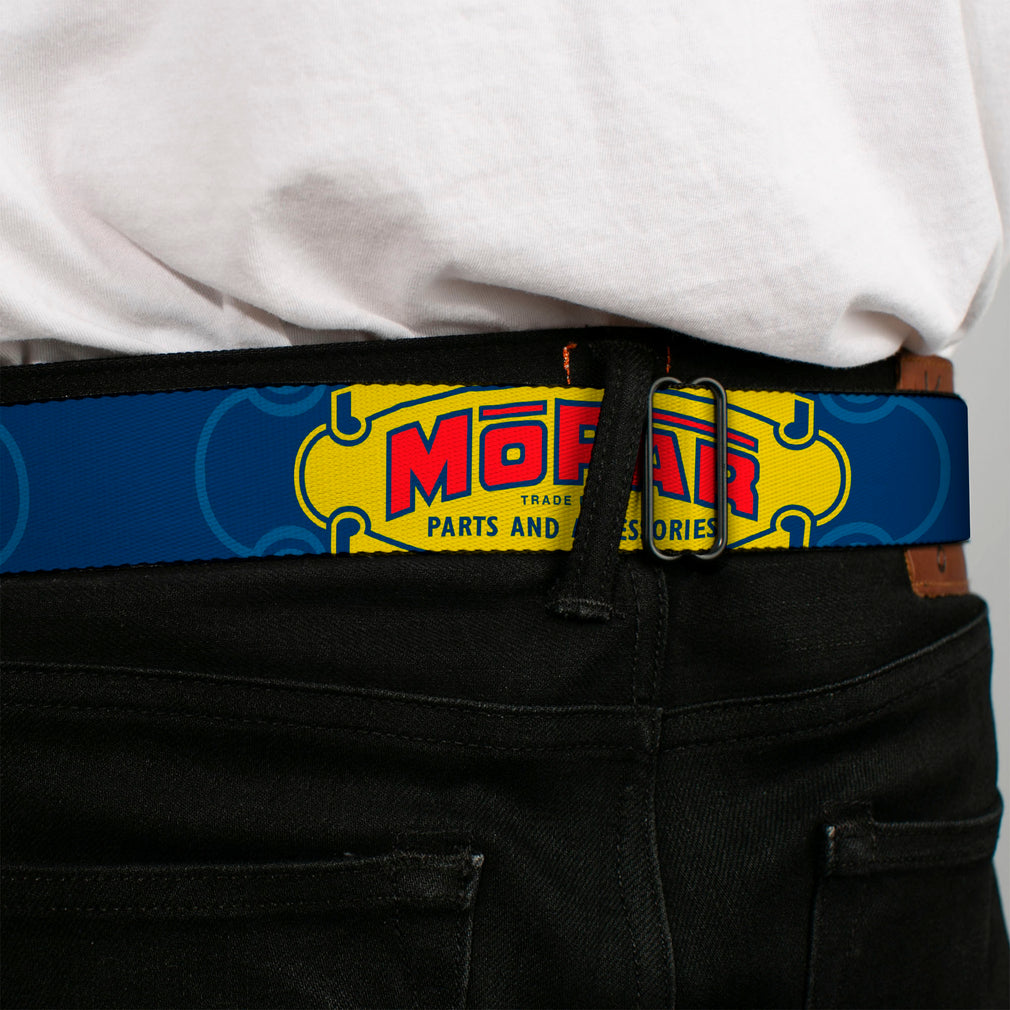 Wholesale MOPAR 1937-1947 Logo Full Color Blue/Yellow/Red Seatbelt Belt - MOPAR 1937-1947 Logo-USE CHRYSLER ENGINEERED MOPAR PARTS AND ACCESSORIES Blue/Yellow/Red Webbing | Wholesale Seatbelt Belts