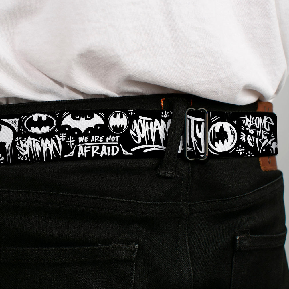 Wholesale Batman Full Color Black/Yellow Seatbelt Belt - Batman Gotham City Graffiti Collage Black/White Webbing | Wholesale Seatbelt Belts