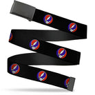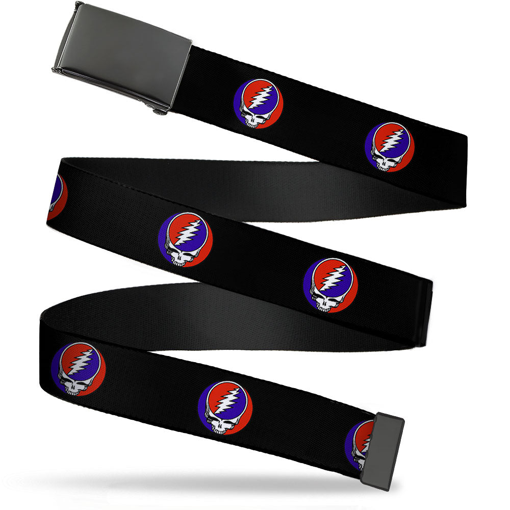 This unique web belt features a solid plain military-style clasp Buckle. It features beautiful artwork which is dyed into the fabric to ensure it looks great for years. This belt is available in 1.0", 1.25", and 1.5" widths. 1.0" wide belt is sized for children and adults with pants size 30 or lower. 1.25" and 1.5" wide belts are sized for adults, fitting up to pant size 42. This web belt is made from high-density nylon and steel. 1.5" wide belt also has a bottle opener built into the back of the buckle! This product is Made in the USA by Buckle-Down Inc. and is officially licensed by Grateful Dead.