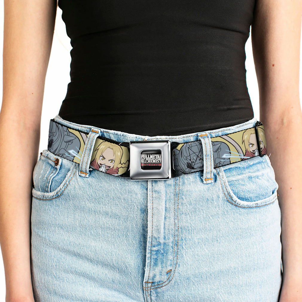 Wholesale FULLMETAL ALCHEMIST BROTHERHOOD Title Logo Full Color Black Seatbelt Belt - Fullmetal Alchemist Brotherhood Chibi Elric Brothers Pose Yellow Webbing | Wholesale Seatbelt Belts