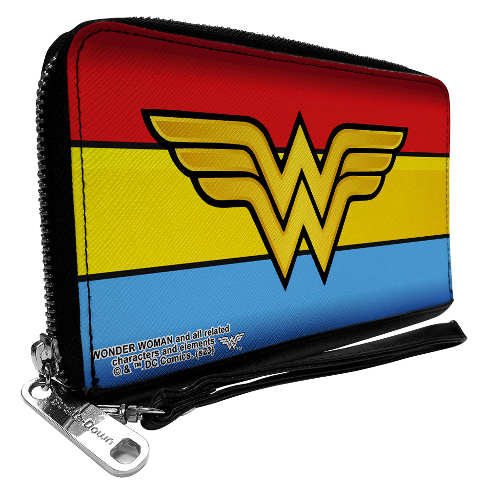 Wholesale PU Zip Around Wallet Rectangle - Wonder Woman Logo/Stripe Red/Yellows/Blue | Wholesale Clutch Zip Around Wallets