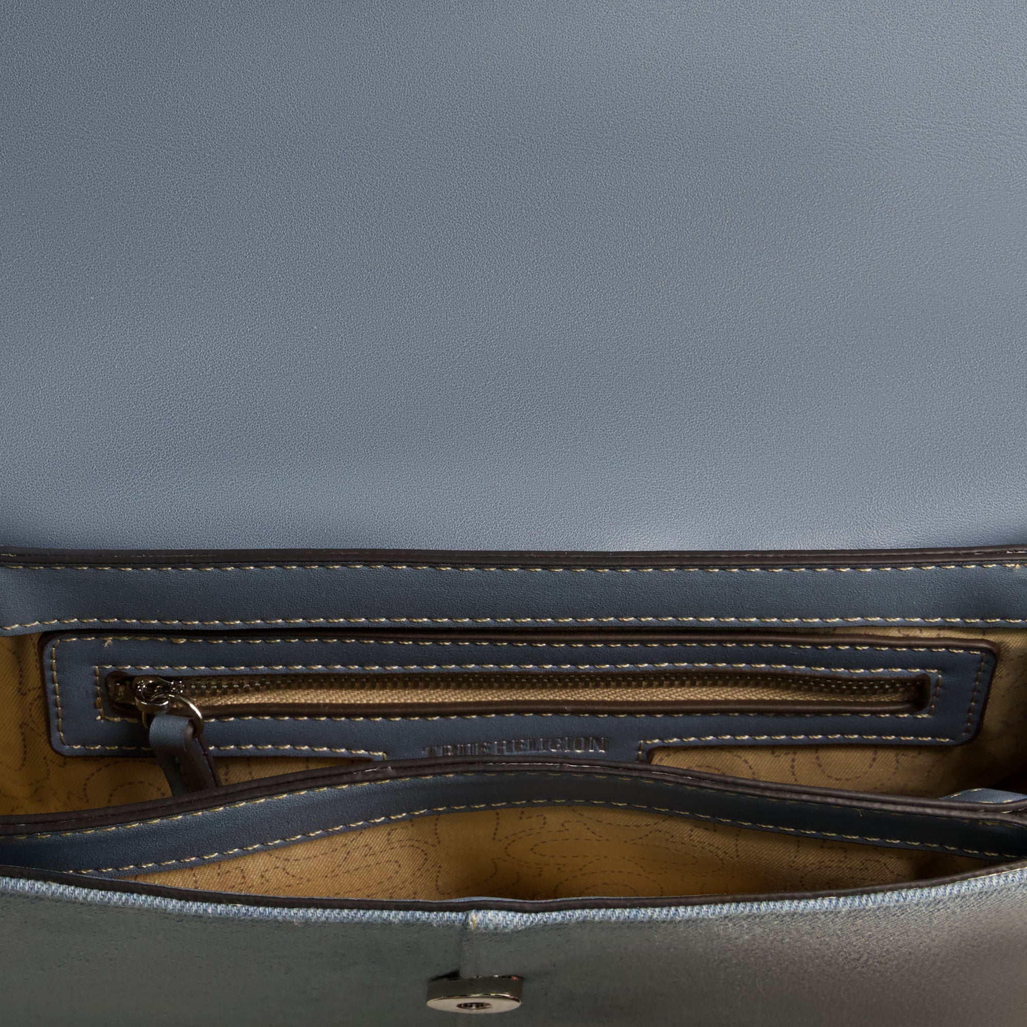 For those who seek style with an edge, the True Religion Licensed Denim Saddle Bag offers a modern twist on a classic accessory. Made from premium light blue denim and tan faux leather, this chic saddle bag is adorned with a striking oversized metallic horseshoe logo, symbolizing True Religion's signature look. The structured design features a flap closure with magnetic snap and a spacious interior with multiple compartments, including a zippered pocket to keep your essentials organized. The adjustable shoulder strap, complete with True Religion branding, allows for comfortable crossbody or shoulder wear, making this bag versatile for any occasion. Complete your look with this standout True Religion saddle bag, perfect for both casual outings and more polished events.