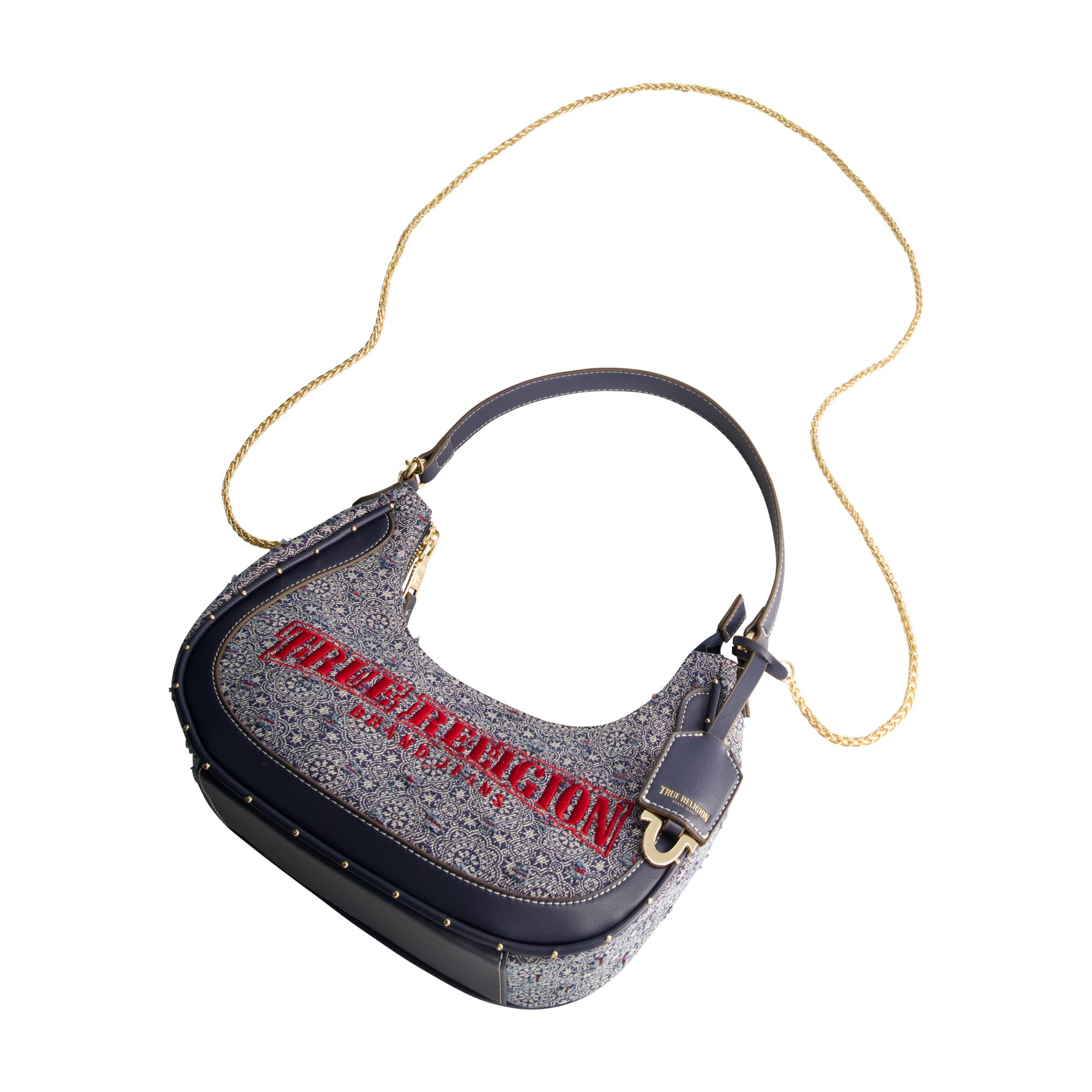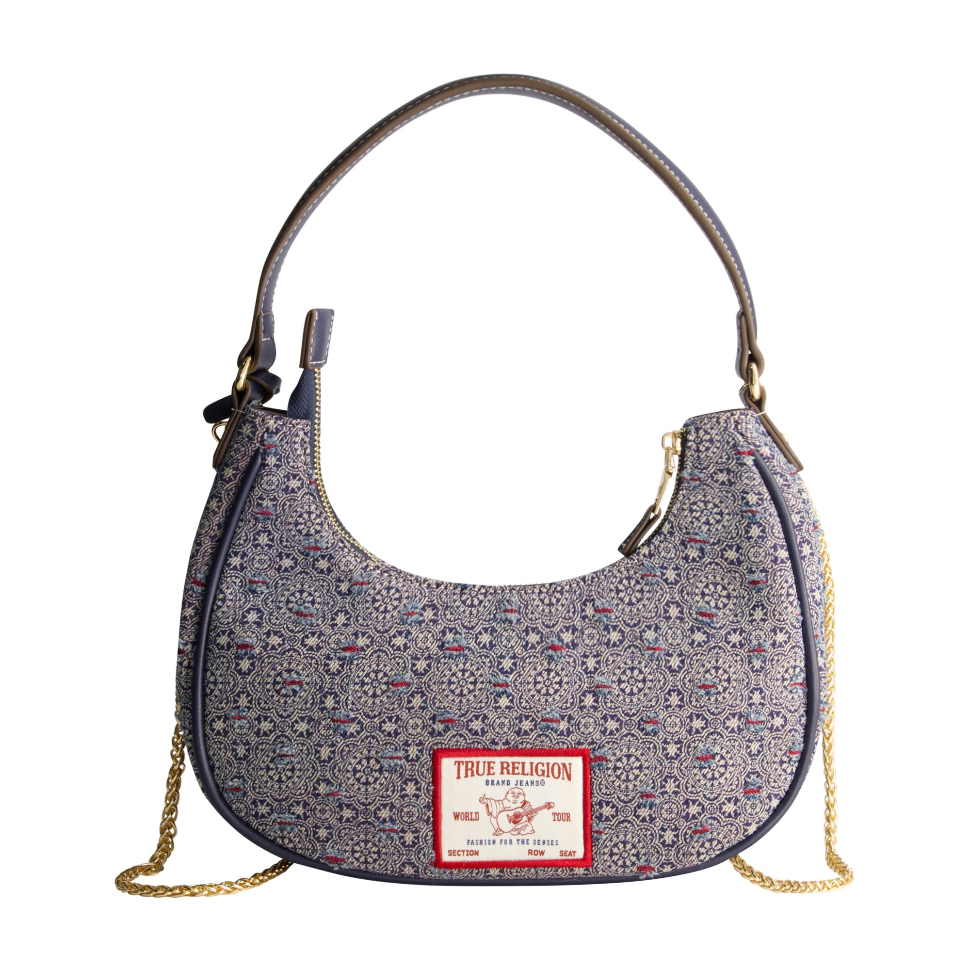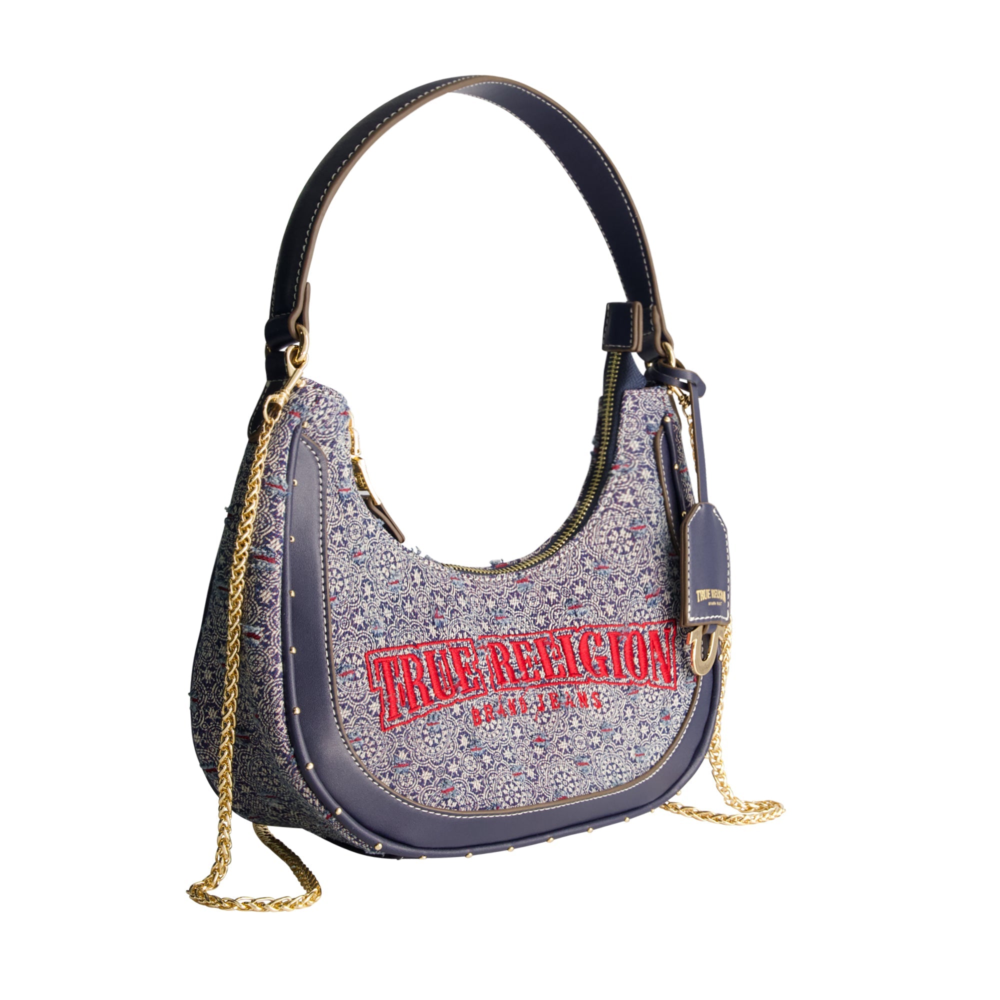 The True Religion Striped Denim Small Hobo is the perfect combination of style and function. Featuring a unique patterned denim exterior with bold True Religion embroidery, this small hobo bag is designed with a zippered closure and gold-tone chain strap for a touch of elegance. With its compact size and statement details, it's the perfect bag to carry from day to night.