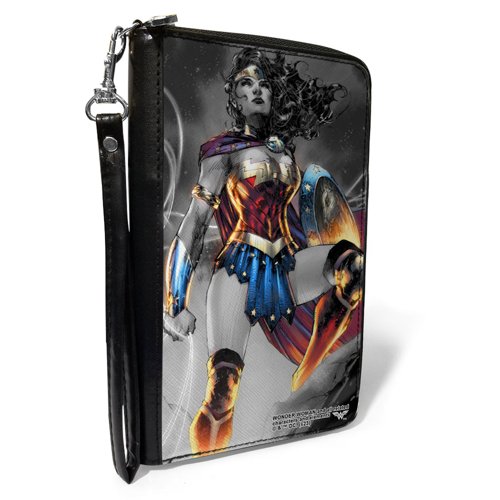 Wholesale PU Zip Around Wallet Rectangle - Wonder Woman 75th Anniversary Comic Book Cover Standing Pose Grays/Full Color