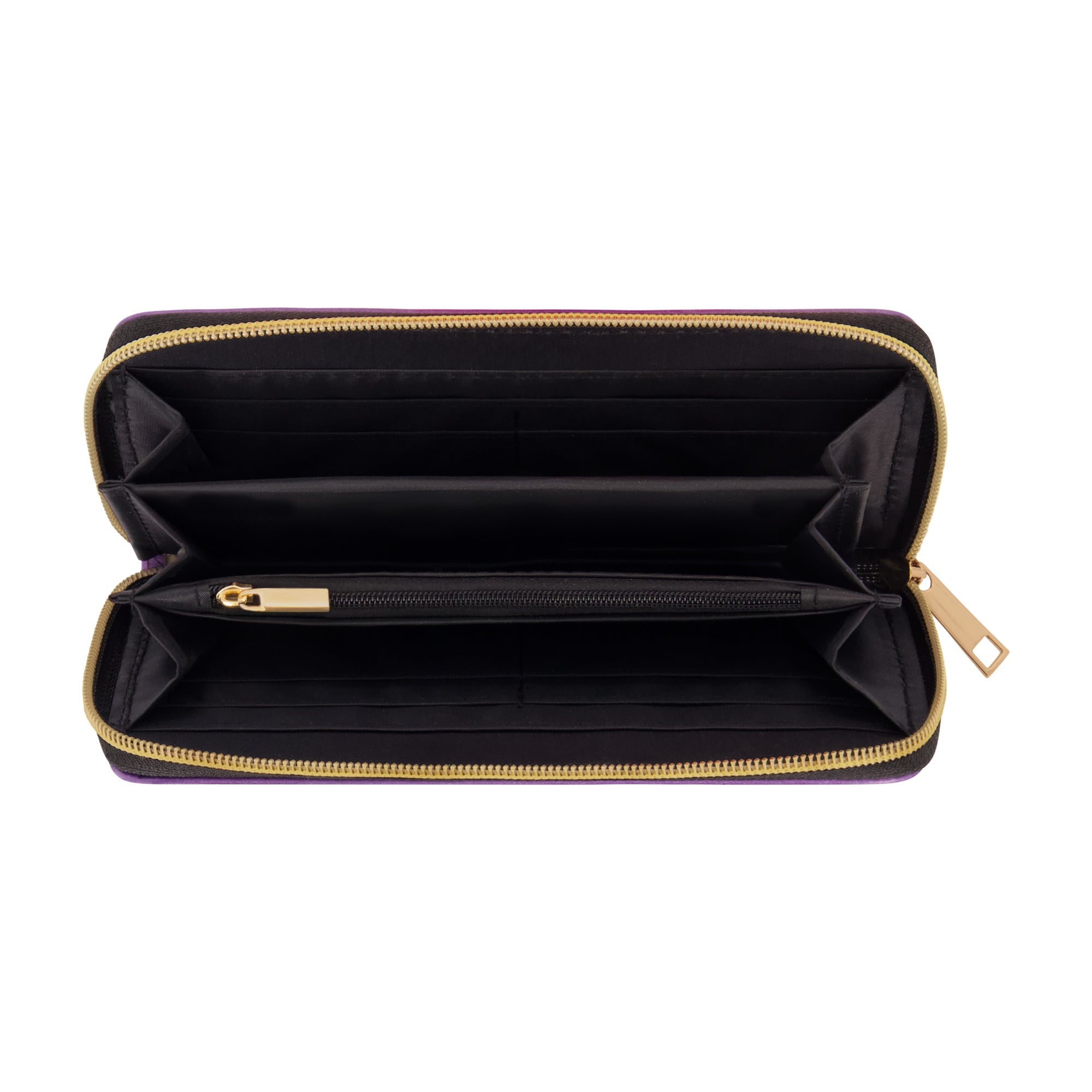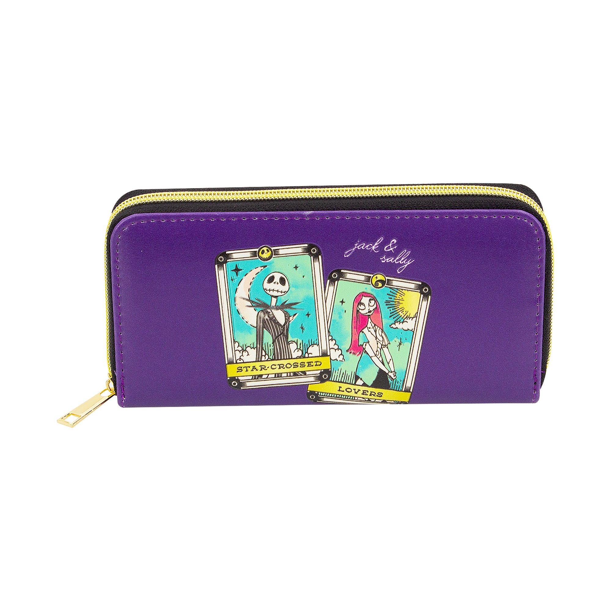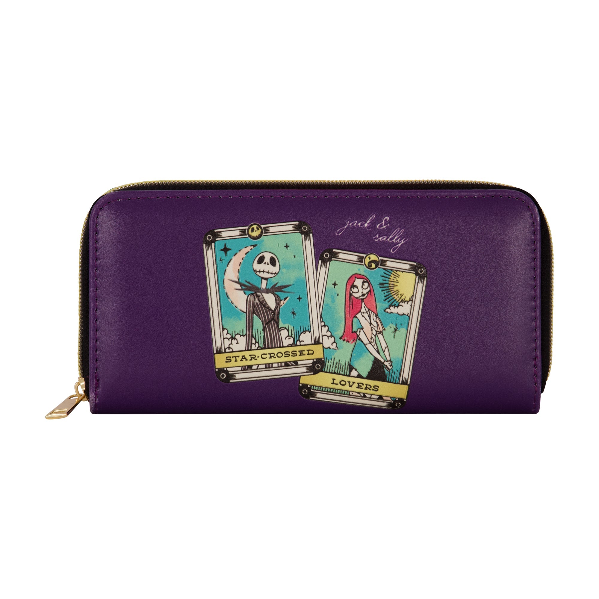 Celebrate your love for The Nightmare Before Christmas with the Jack and Sally Star-Crossed Lovers Tarot Zip Around Wallet in Purple. This officially licensed Nightmare Before Christmas wallet features a beautifully detailed tarot card-inspired design of Jack and Sally, making it the perfect accessory for fans of this beloved movie.Designed with functionality in mind, this zip-around wallet offers multiple interior pockets for organizing your cards and receipts. The interior includes four card slots, one slip pocket, two middle compartments, and a zippered coin divider to keep your essentials secure. The wallet's gold hardware and exterior zip closure ensure that your belongings stay safe inside while providing a sleek, stylish look.Key Features:
