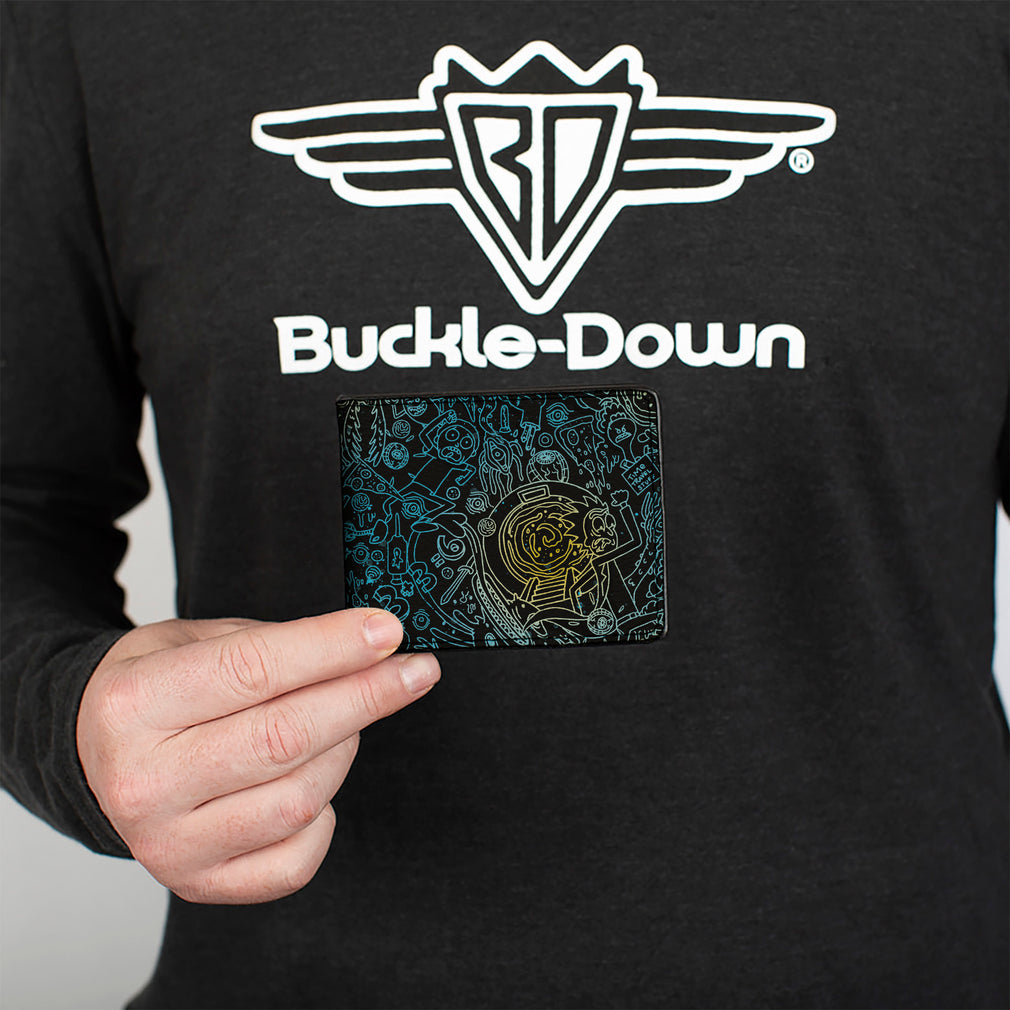 Wholesale Bi-Fold Wallet - Rick and Morty Portal Chase and Icons Collage Black/Blues/Yellows