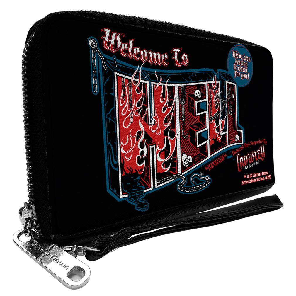 Wholesale PU Zip Around Wallet Rectangle - Supernatural Crowley WELCOME TO HELL Flames Skulls and Chains Black/Blue/Red/White