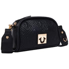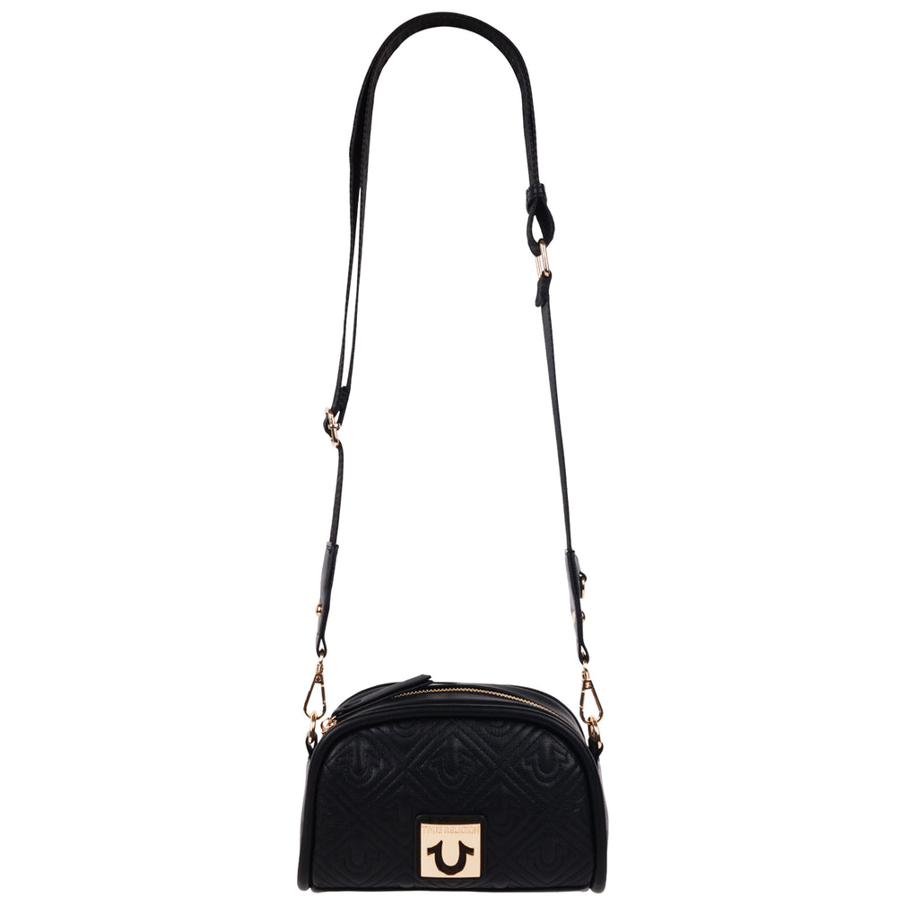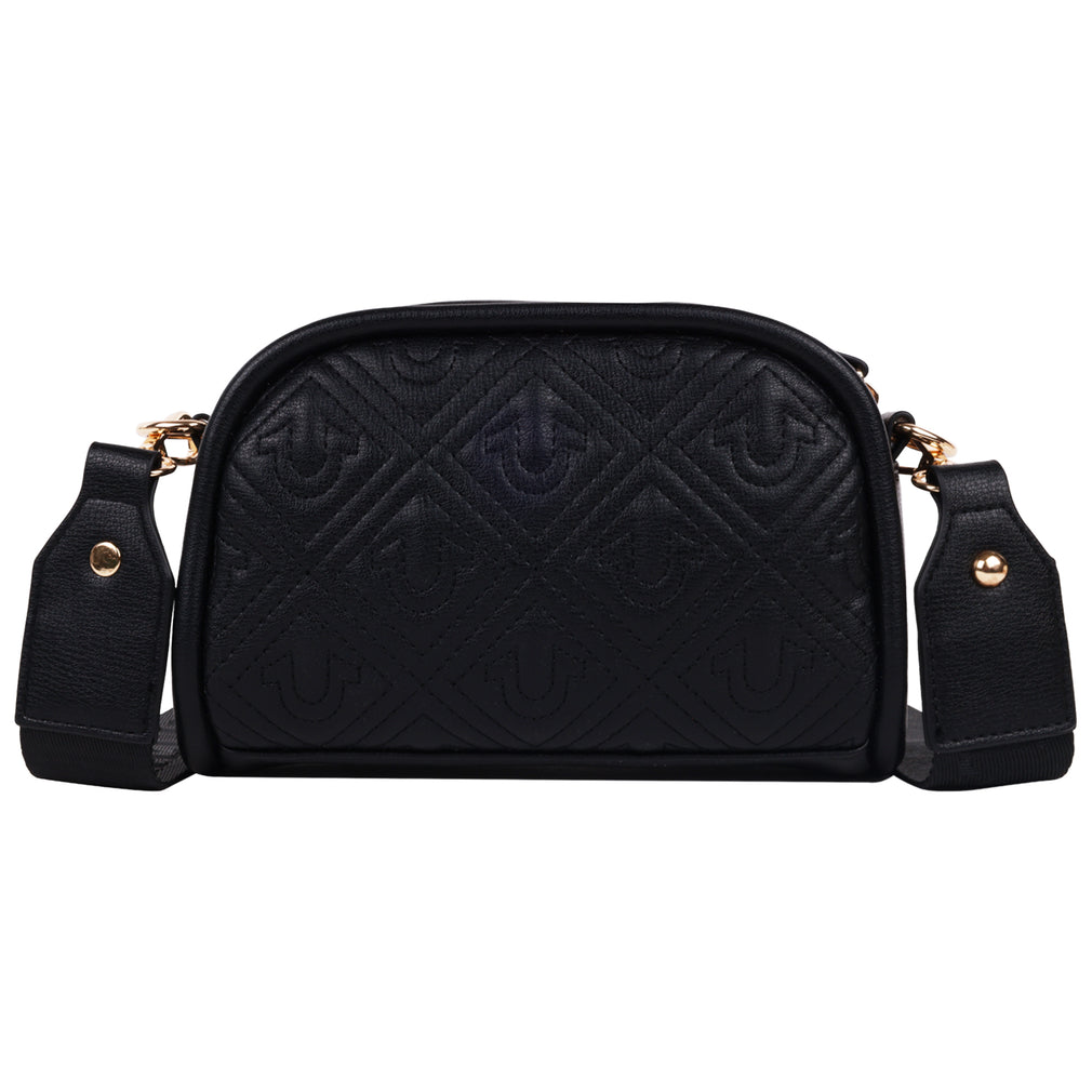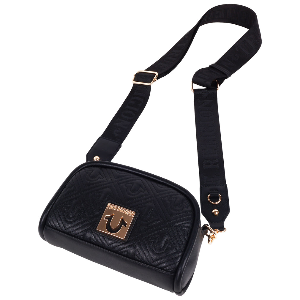 Elevate your everyday look with the True Religion Metal Plaque Quilted Crossbody. Featuring an all-over quilted horseshoe pattern and luxe gold-tone hardware, this sleek bag is designed to turn heads. The structured compact silhouette includes a secure zip-top closure, interior zip pocket, and signature branded lining. Finished with a bold metal logo plaque at the front and an adjustable shoulder strap for versatile styling.