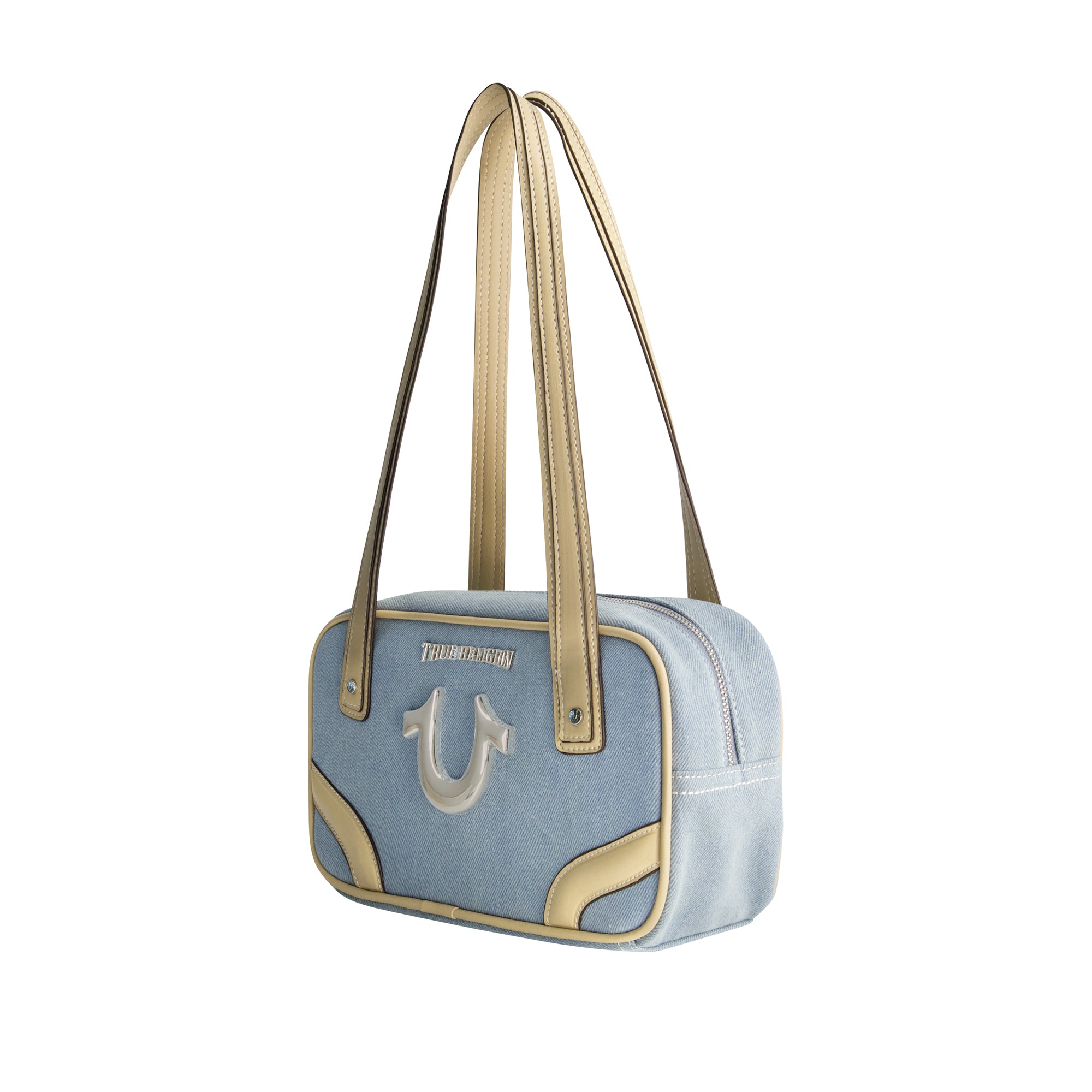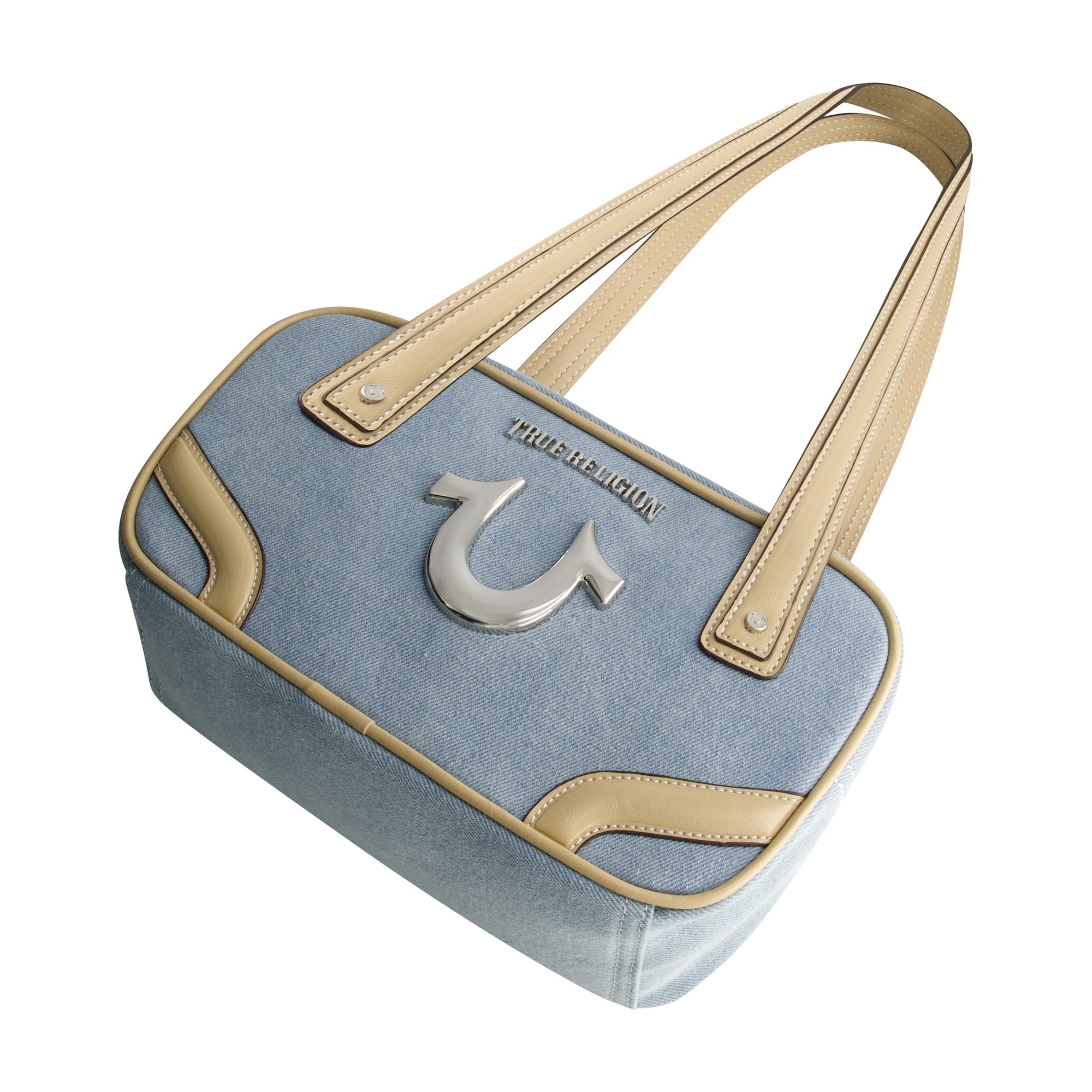 Retro-inspired with a modern edge, the True Religion Small Denim Bowling Satchel is a standout piece for any handbag collection. Designed with a structured bowling shape, contrast leather piping, and a bold metallic horseshoe logo, this bag offers both style and practicality. The double shoulder straps and secure zip closure make it the perfect grab-and-go accessory.