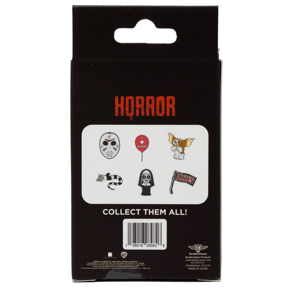 Introducing Buckle-Down's exciting new series, the Warner Bros. Horror Movies Collectible Pin Blind Box! This Blind Mystery Box could get you any of the various characters and icons including: Gizmo, Sandworm, IT's Balloon, Jason's Hockey Mask, A Nightmare on Elm Street Sign, or The Nun. Perfect surprise gift for kids, teens, and adults who love the Warner Bros. Horror Movies series! Also makes a great Christmas stocking stuffer, Easter basket stuffer, or party favor. Collect all 6 to complete the set!