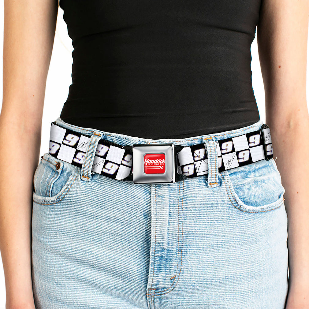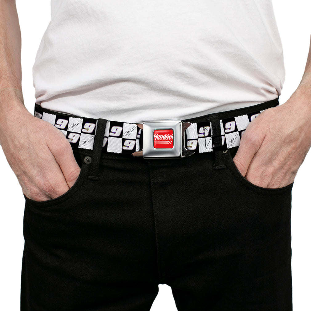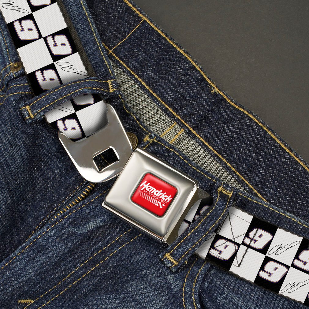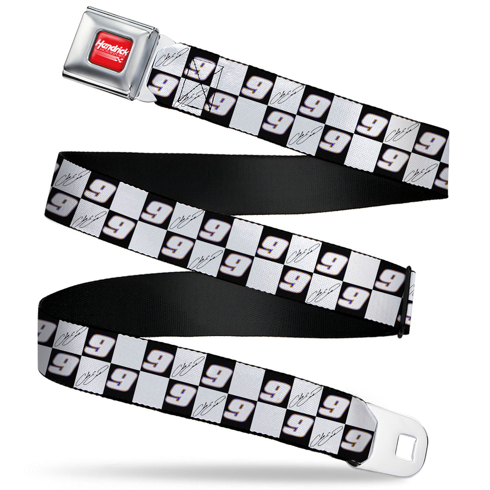 HENDRICK MOTORSPORTS Checker Logo Full Color Red/White Seatbelt Belt - Chase Elliott Autograph and Number 9 Checker Black/White/Blue Webbing | Wholesale Seatbelt Belts