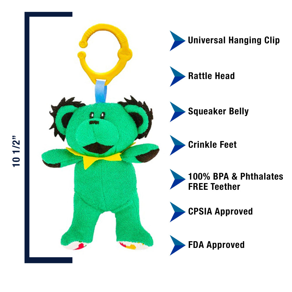 This plush toy is perfect for soothing and entertaining, complete with a universal hanging clip for convenient attachment to play mats, strollers, or car seats. Made from soft terry cloth and including a BPA & Phthalates free teether, this green bear is both safe and gentle for all ages.